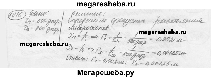 1615. У «сильных» микроскопов оптическая сила объективов равна 500 дптр, а у самых сильных — 800 дптр. Каковы фокусные расстояния у этих микроскопов?