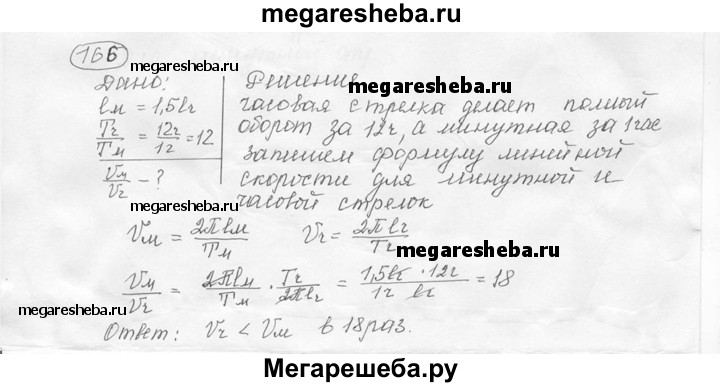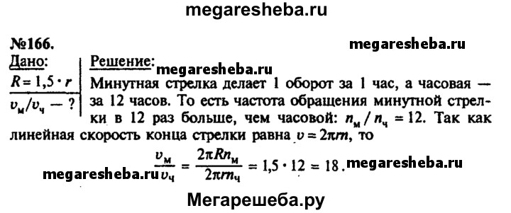 166. Минутная стрелка часов в 1,5 раза длиннее часовой. Определите, во сколько раз линейная скорость конца часовой стрелки меньше, чем линейная скорость конца минутной стрелки.