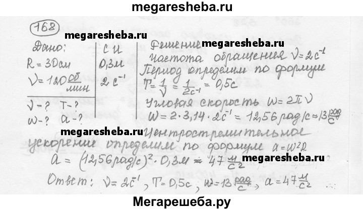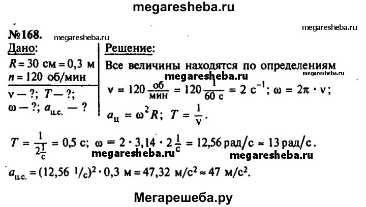 168. Шкив радиусом 30 см имеет частоту вращения 120 об/мин. Определите частоту, период обращения, угловую скорость шкива и центростремительное ускорение точек шкива, наиболее удаленных от оси вращения.