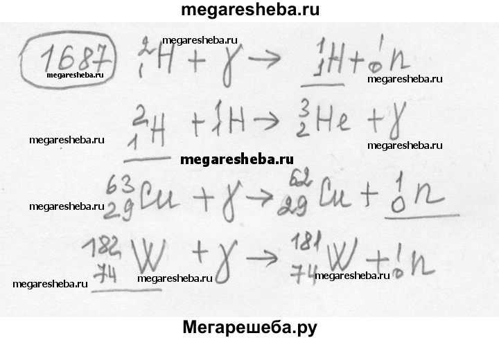 1687. Допишите недостающие обозначения: 2(1)Н + у -> X + 1(0)n Х + 1(1)H —> 3(2)Не + у 63(29)Cu + y -> 62(29)Cu + X X + Y -> 181(74)W + 1(0)n