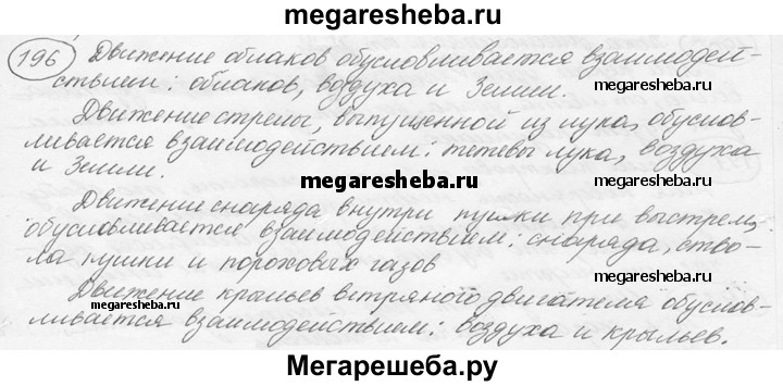 196. Взаимодействием каких тел движение облаков; стрелы, выпущенной из лука; снаряда внутри ствола пушки при выстреле; вращение крыльев ветряного двигателя?