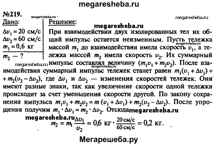 219. При взаимодействии двух тележек их скорости изменились на 20 и 60 см/с. Масса большей тележки 0,6 кг. Чему равна масса меньшей тележки?