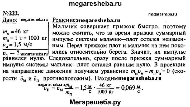 222. Мальчик, масса которого 46 кг, прыгнул на берег со скоростью 1,5 м/с с неподвижного плота массой 1 т. Какую скорость приобрел плот относительно берега?
