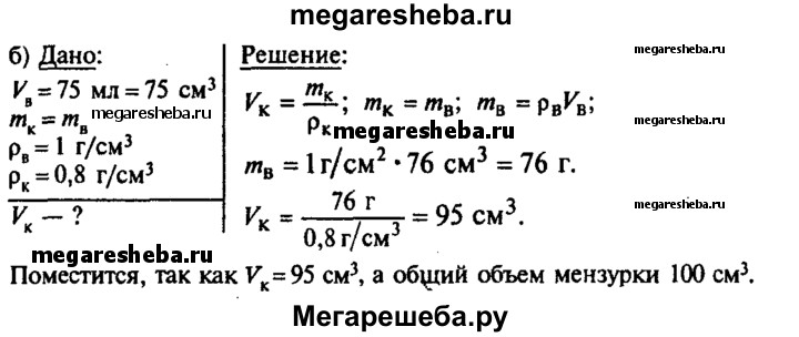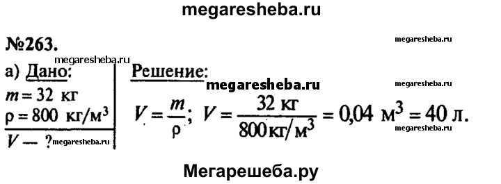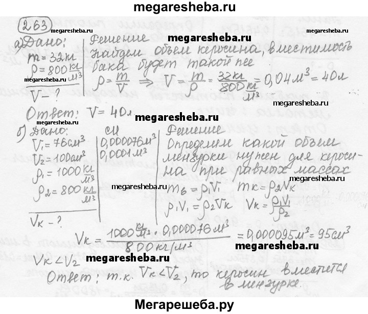 263. а) Когда бак целиком наполнили керосином, то оказалось, что масса его увеличилась на 32 кг. Какова вместимость бака? б) В средней мензурке налита вода (см. рис. 9). Поместится ли в этой мензурке такая же масса керосина, если воду вылить?