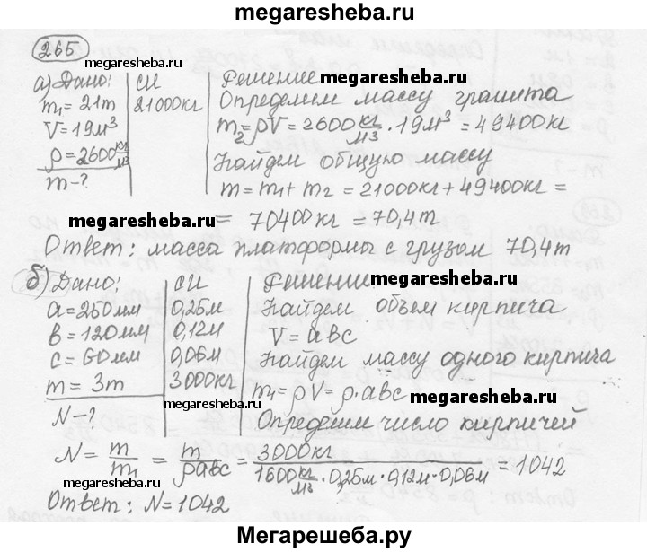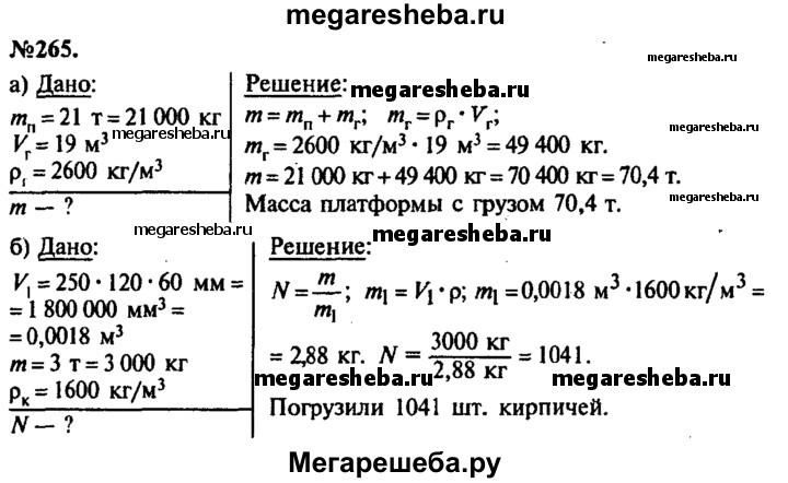 265. а) На железнодорожную четырехосную платформу массой 21 т погрузили гранит объемом 19 м3. Какой стала общая масса платформы с грузом? б) Сколько штук кирпичей размером 250X120X60 мм погрузили на автоприцеп, если масса его увеличилась на 3 т?