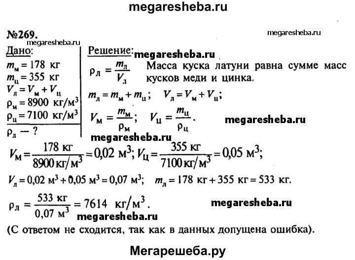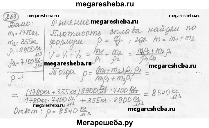 269. Чтобы получить латунь, сплавили кусок меди массой 1780 кг и кусок цинка массой 355 кг. Какой плотности была получена латунь? (Объем сплава равен сумме объемов его составных частей.)