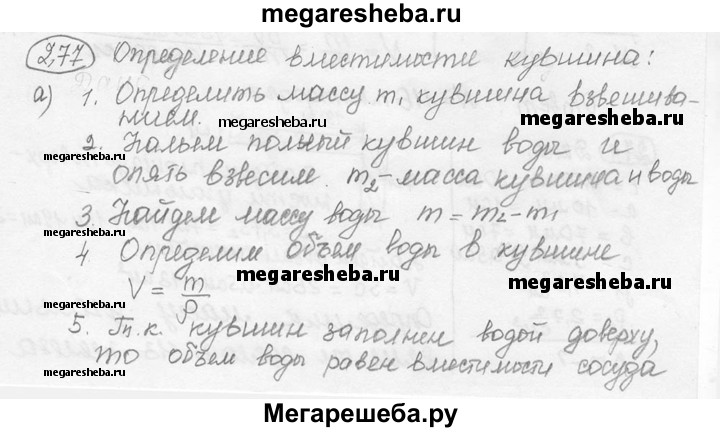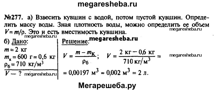 277. а)0 В вашем распоряжении находятся только кувшин, весы с гирьками и сосуд с водой. Объясните, как бы вы поступили, используя лишь эти тела, чтобы определить вместимость кувшина. б) Когда сосуд целиком наполнили бензином, его масса стала равна 2 кг. Масса этого же сосуда без бензина равна 600 г. Какова вместимость сосуда?