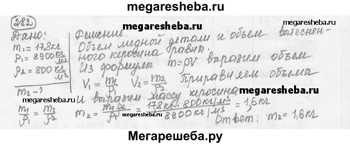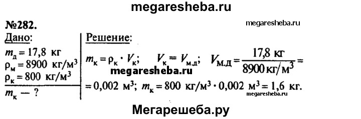 282. Для промывки медной детали массой 17,8 кг ее опустили в бак с керосином. Определите массу керосина, вытесненного этой деталью.