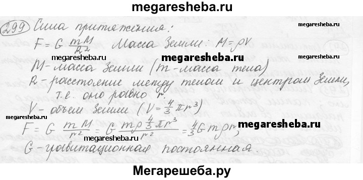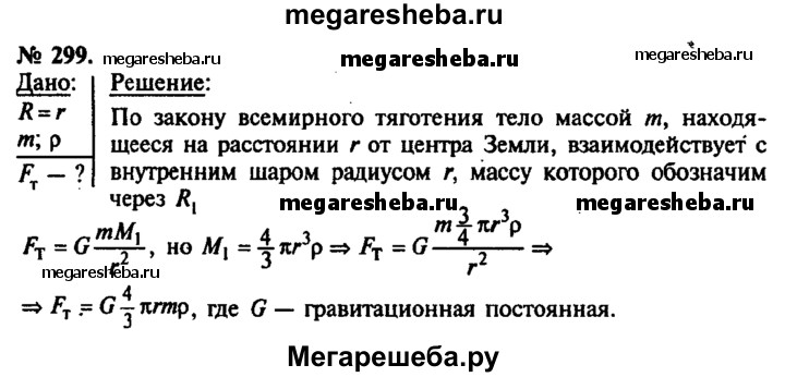 299. С какой силой притягивается к центру Земли тело массой т, находящееся в глубокой шахте, если расстояние от центра Земли до тела равно г? Плотность Земли считайте всюду одинаковой и равной р.