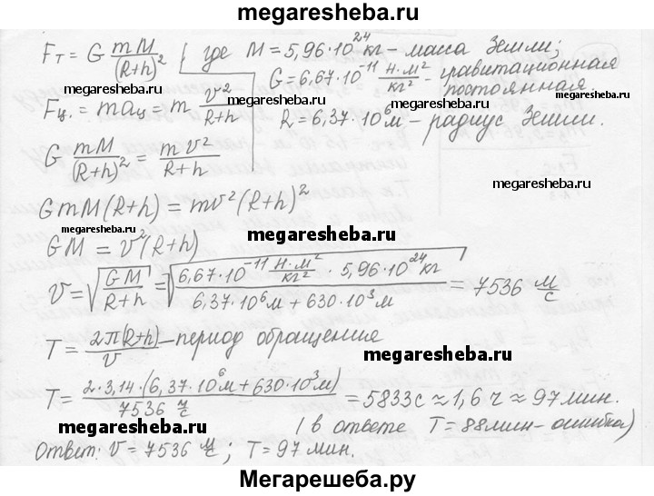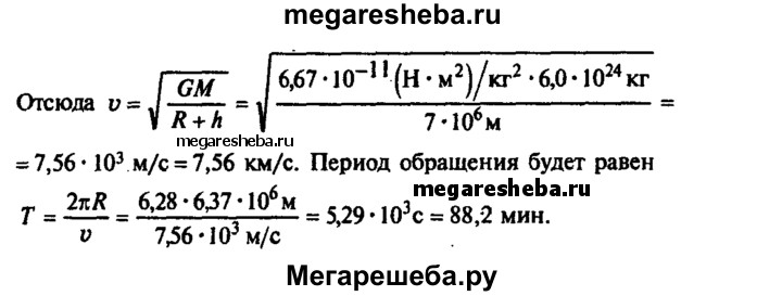302. Какую скорость должен иметь искусственный спутник, чтобы обращаться по круговой орбите на высоте 630 км над поверхностью Земли? Каков период его обращения? (Спутник запускается в направлении с севера на юг.)