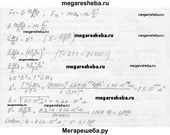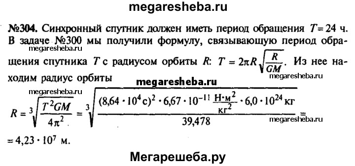 304. На какое расстояние от центра Земли должен быть запущен синхронный спутник, т. е. спутник, висящий над одной и той же точкой земной поверхности? Определите линейную скорость спутника при обращении по орбите.