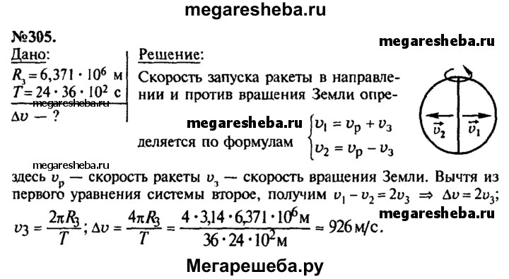 305. На сколько отличаются скорости запуска ракет относительно Земли, которые должны стать искусственными спутниками Земли, если они запускаются на экваторе: одна — в направлении вращения Земли, а другая — в направлении против вращения Земли?
