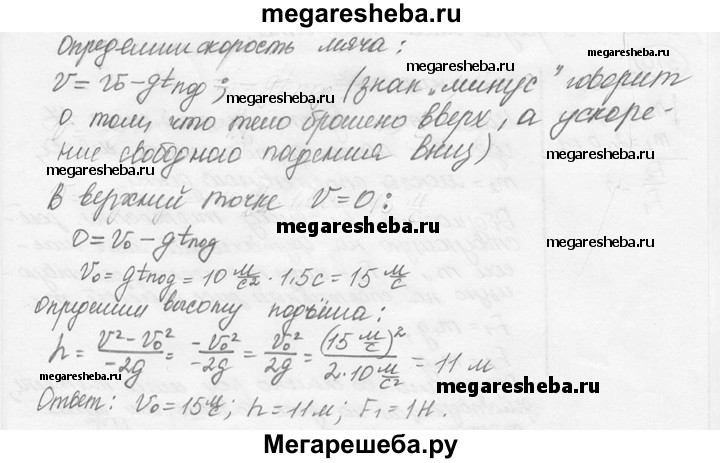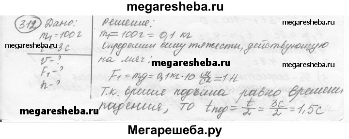 312. Брошенный вертикально вверх мяч массой 100 г вернулся на Землю через 3 с. Определите скорость мяча, силу тяжести, действующую на мяч, и высоту, на которую он поднялся.