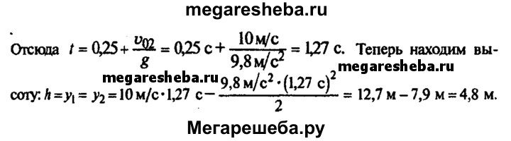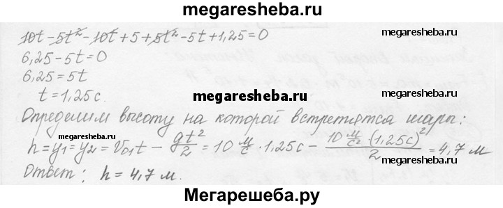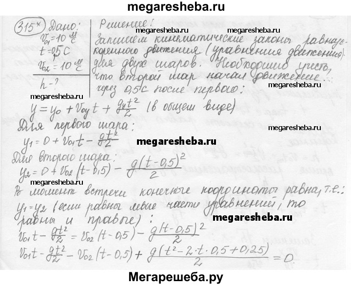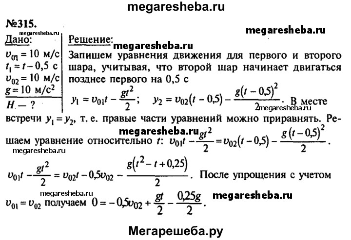 315. Жонглер в цирке подбрасывает вертикально вверх шар с начальной скоростью 10 м/с. Через 0,5 с с такой же скоростью следом за первым шаром вверх брошен второй шар. На какой высоте от точки бросания встретятся шары?