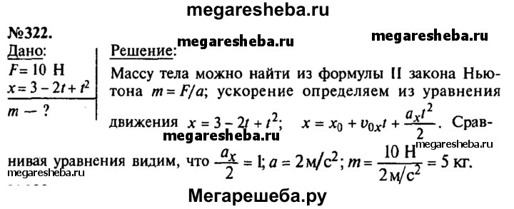 322. Под действием постоянной силы, равной 10 Н, тело движется прямолинейно так, что зависимость координаты тела от времени описывается уравнением х = 3 - 21 +12. Определите массу тела.