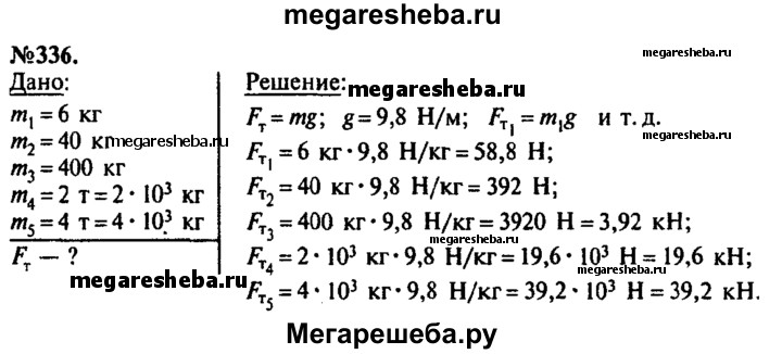 336. Чему равна сила тяжести, действующая на зайца, волка, медведя, носорога, слона, если их массы соответственно равны 6 кг, 40 кг, 400 кг, 2 т, 4 т?