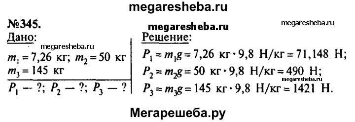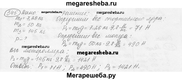 345. Вычислите вес спортивного ядра, мопеда «Верховина-5», мотороллера «Турист-М», если массы их соответственно равны 7,26 кг, 50 кг, 145 кг.