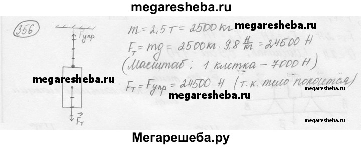 356. На тросе подъемного крана висит контейнер с грузом массой 2,5 т. Изобразите графически в выбранном вами масштабе силы, действующие на контейнер.