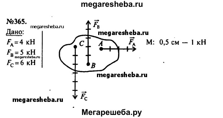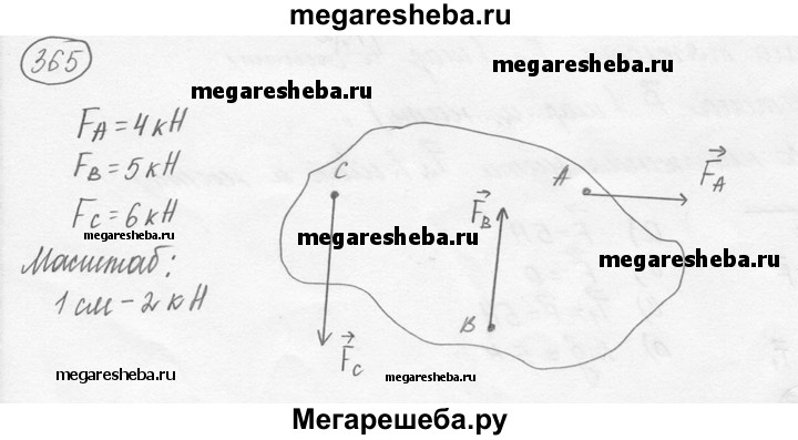 365. Изобразите графически силы, приложенные к телу (рис. 81): в точке А силу 4 кН, действующую горизонтально слева направо; в точке В силу 5 кН, направленную вертикально вверх; в точке С силу 6 кН, направленную вертикально вниз (масштаб: 1 см — 2 кН).