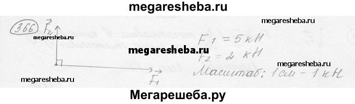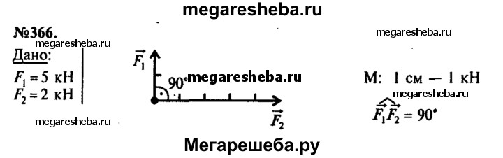 366. Изобразите графически две силы: 5 и 2 кН, приложенные к одной точке тела и действующие под углом 90° друг к другу (масштаб: 1 см — 1 кН).