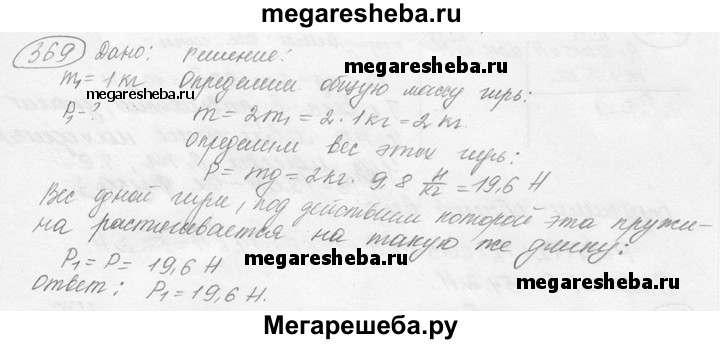 369. Пружина растянулась под действием двух гирь. Масса каждой гири равна 1 кг. Чему равен вес одной гири, под действием которой эта пружина растягивается на такую же длину?