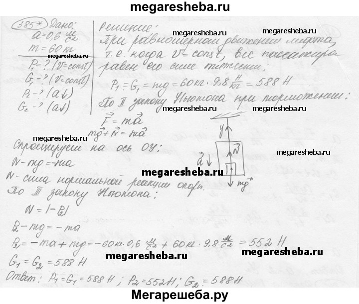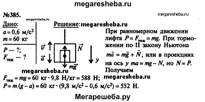 385. Пассажирский лифт, поднимающийся с постоянной скоростью, на верхних этажах движется равноза-медленно с ускорением 0,6 м/с2. Чему равны вес пассажира массой 60 кг и сила тяжести, действующая на него при равномерном подъеме; при торможении?