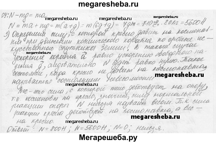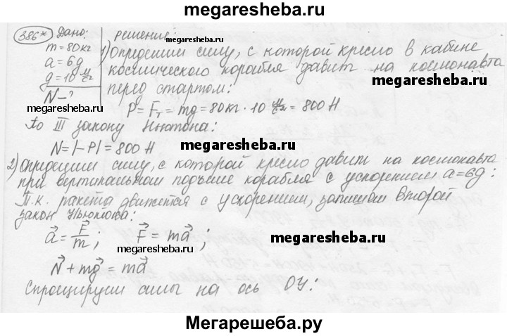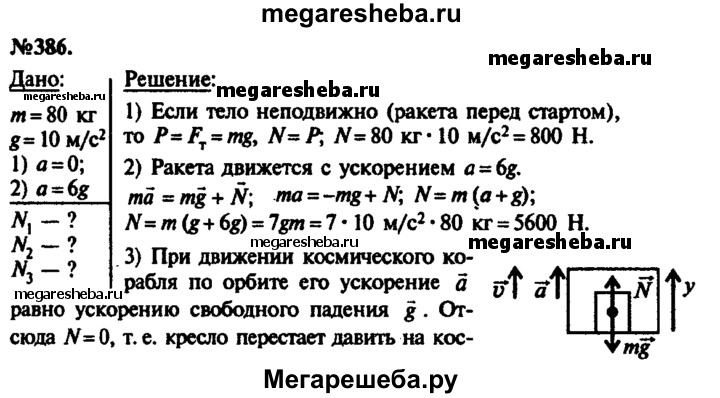 386. Определите силу, с которой кресло в кабине космического корабля давит на космонавта массой 80 кг перед стартом; при вертикальном подъеме корабля с ускорением a = 6g (где g~ 10 м/с2); при движении по орбите искусственного спутника Земли. Можно ли назвать эту силу весом космонавта?