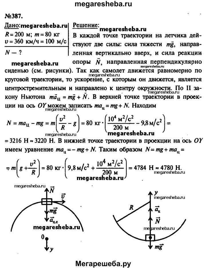 387. Самолет делает «мертвую петлю». Определите значение силы, с которой летчик давит на сиденье в верхней и нижней точках траектории движения, если радиус «петли» равен 200 м, масса летчика равна 80 кг, скорость самолета равна 360 км/ч?