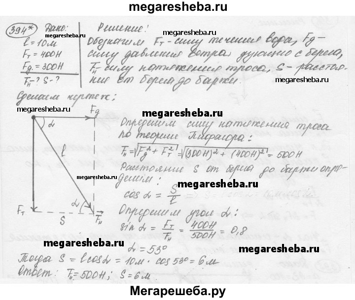 394. На баржу, привязанную к берегу тросом длиной 10 м, действует сила течения воды, равная 400 Н, и сила давления ветра 300 Н, дующего с берега. С какой силой натянут трос, если баржа находится в равновесии? На каком расстоянии от берега она расположена?