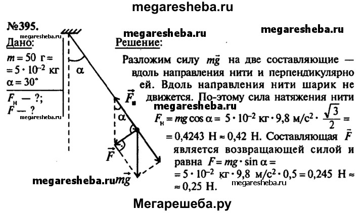 395. Нить с шариком массой 50 г отклонили от положения равновесия на угол 30°, а затем отпустили. Найдите силу, стремящуюся вернуть шарик в положение равновесия, и силу натяжения нити в момент начала движения.
