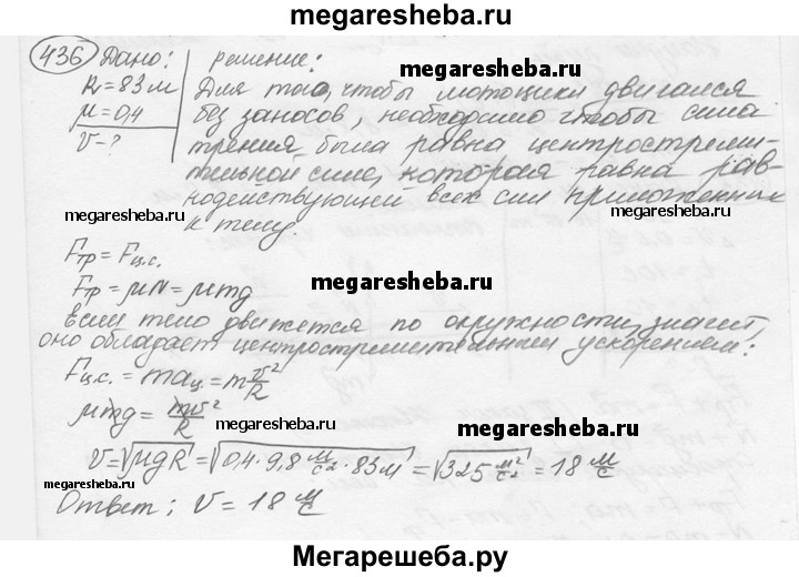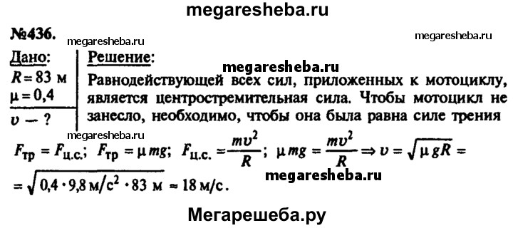 436. С какой скоростью сможет ехать по горизонтальной плоскости мотоциклист, описывая дугу радиусом 83 м, если коэффициент трения резины о почву равен 0,4?