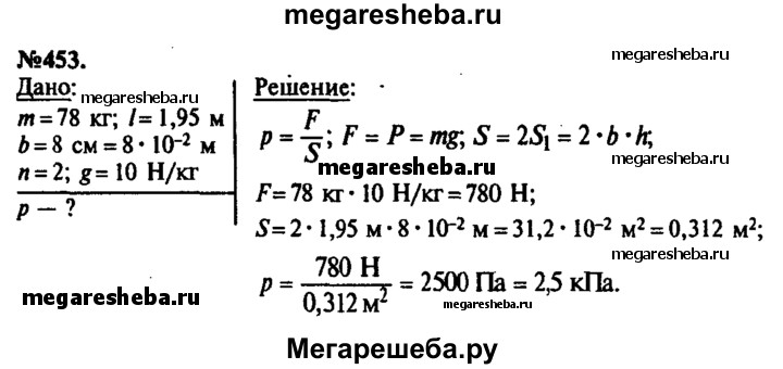 453. Спортсмен, масса которого 78 кг, стоит на лыжах. Длина каждой лыжи 1,95 м, ширина 8 см. Какое давление оказывает спортсмен на снег?