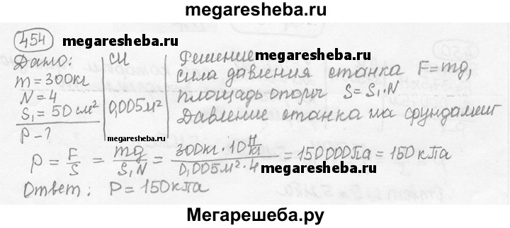 454. Токарный станок массой 300 кг опирается на фундамент четырьмя ножками. Определите давление станка на фундамент, если площадь каждой ножки 50 см2.