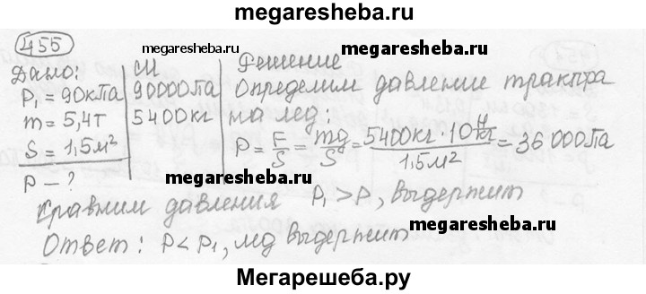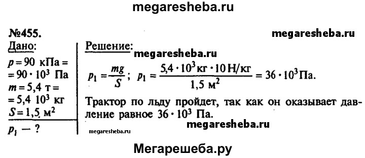 455. Толщина льда такова, что лед выдерживает давление 90 кПа. Пройдет ли по этому льду трактор массой 5,4 т, если он опирается на гусеницы общей площадью 1,5 м2?