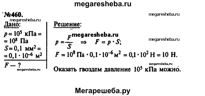 460. Можете ли вы гвоздем оказать давление, равное 105 кПа? Рассчитайте, какую силу для этого надо приложить к шляпке гвоздя, если площадь острия гвоздя равна 0,1 мм2.
