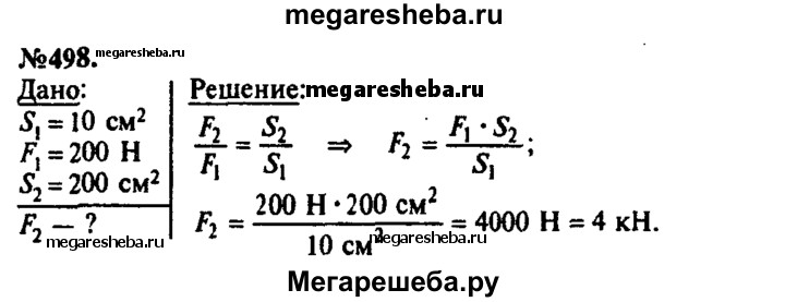498. Площадь меньшего поршня гидравлического пресса 10 см2. На него действует сила 200 Н. Площадь большего поршня 200 см2. Какая сила действует на больший поршень?