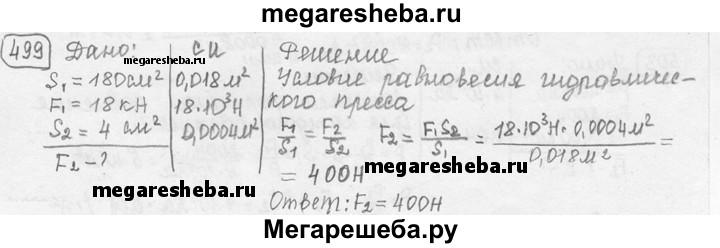 499. Поршень гидравлического пресса площадью 180 см2 действует силой 18 кН. Площадь малого поршня 4 см2. С какой силой действует меньший поршень на масло в прессе?