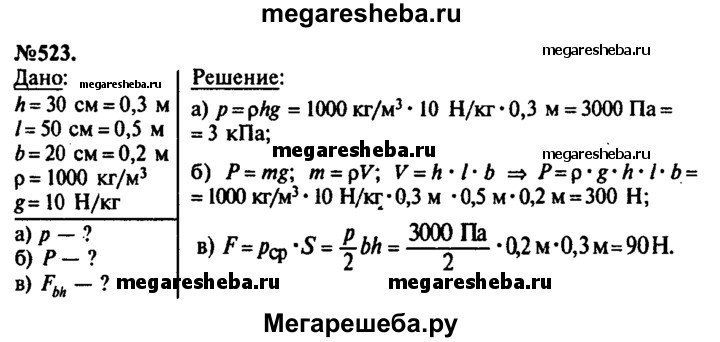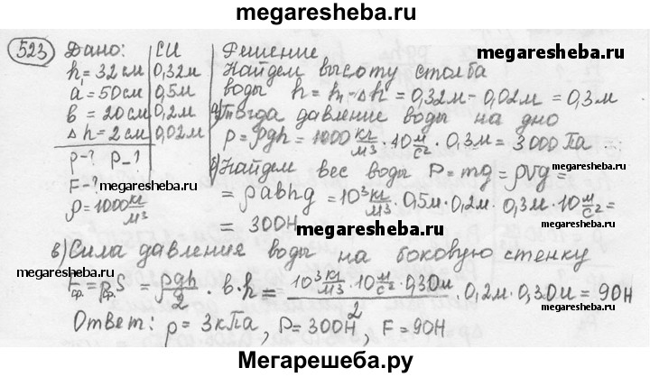 523. В аквариум высотой 32 см, длиной 50 см и шириной 20 см налита вода, уровень которой ниже края на 2см. Рассчитайте: а) давление воды на дно; б) вес воды; в) силу, с которой вода действует на стенку шириной 20 см.