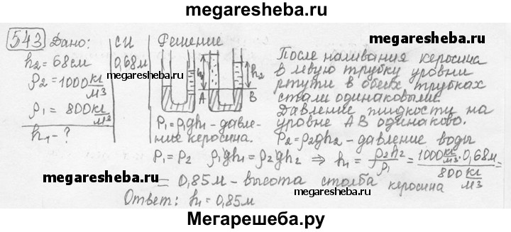 543. В сообщающихся сосудах находятся ртуть и вода (рис. 149). Высота столба воды 68 см. Какой высоты столб керосина следует налить в левое колено, чтобы ртуть установилась на одинаковом уровне?