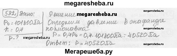 582. Первый в мире выход из космического корабля в космическое пространство совершил А. Леонов. Давление в скафандре космонавта составляло 0,4 нормального атмосферного давления. Определите числовое значение этого давления.