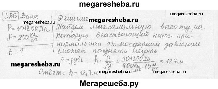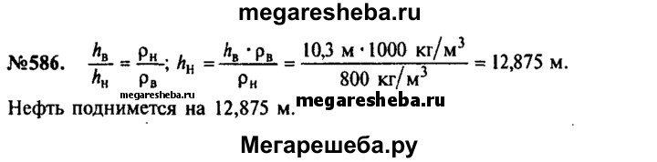 586. При нормальном атмосферном давлении вода за поршнем всасывающего насоса поднимается не более чем на 10,3 м. На какую высоту при всех равных условиях поднимается за поршнем нефть?
