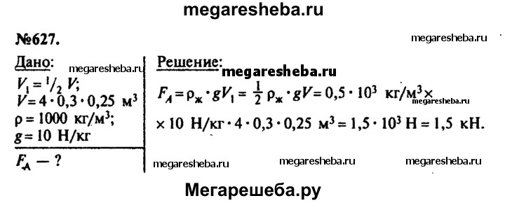627. Железобетонная плита размером 4x0,3x0,25 м погружена в воду на половину своего объема. Какова архимедова сила, действующая на нее?