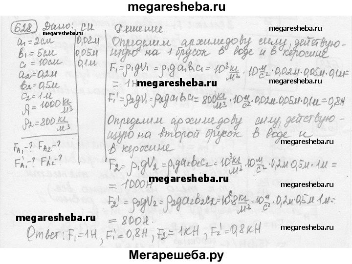 628. Один брусок имеет размер 2x5x10 см, а соответствующий размер другого бруска в 10 раз больше (0,2x0,5x1 м). Вычислите, чему будут равны архимедовы силы, действующие на эти бруски при полном погружении их в пресную воду, в керосин.