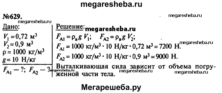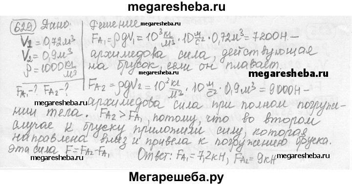 629. Плавающий на воде деревянный брусок вытесняет воду объемом 0,72 м3, а будучи погруженным в воду целиком — 0,9 м3. Определите выталкивающие силы, действующие на брусок. Объясните, почему различны эти силы.