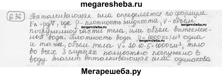 636. Брусок размером 20 х 10 х 5 см может занимать в воде указанные на рисунке 192 положения. Докажите, что на него действует одна и та же выталкивающая сила.