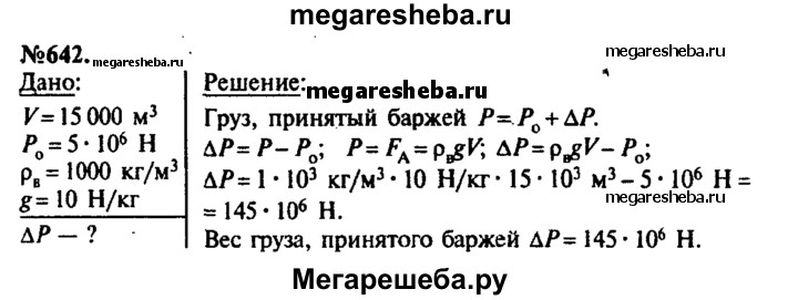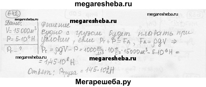 642. Судно, погруженное в пресную воду до ватерлинии, вытесняет воду объемом 15 000 м3. Вес судна без груза равен 5 • 10® Н. Чему равен вес груза?