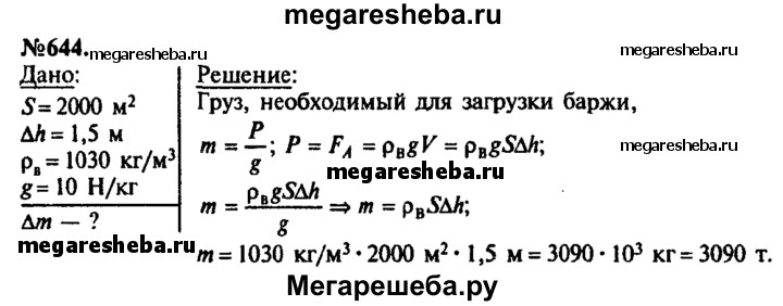 644. Площадь сечения теплохода на уровне воды равна 2000 м2. Сколько нужно добавить груза, чтобы теплоход погрузился в морской воде еще на 1,5 м, считая, что борта его на данном уровне вертикальны?