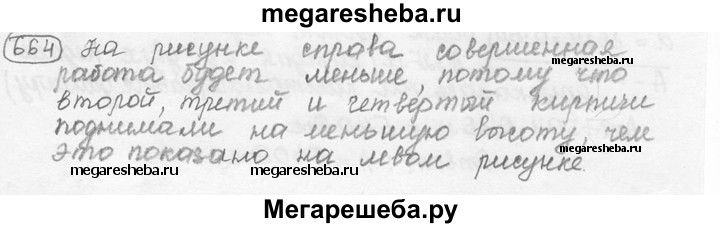 664. На одном горизонтальном уровне стоят две стопки из трех одинаковых кирпичей (рис. 197, внизу). Кирпичи равномерно поднимают и кладут на доску так, как показано на рисунке 197 (вверху). Одинаковую ли при этом совершают работу?