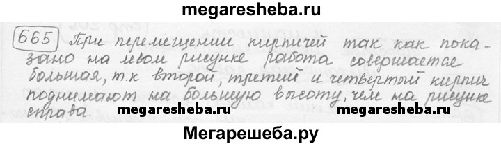 665. Одинаковые кирпичи лежат на одном горизонтальном уровне (рис. 198, внизу). Кирпичи равномерно поднимают и кладут так, как показано на рисунке 198 (вверху). Одинаковую ли работу при этом совершают?