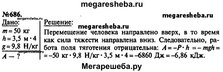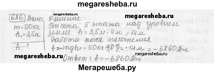 686. Какую работу совершает поле тяготения, когда человек массой 50 кг поднимается на пятый этаж здания, если высота одного этажа равна 3,5 м?